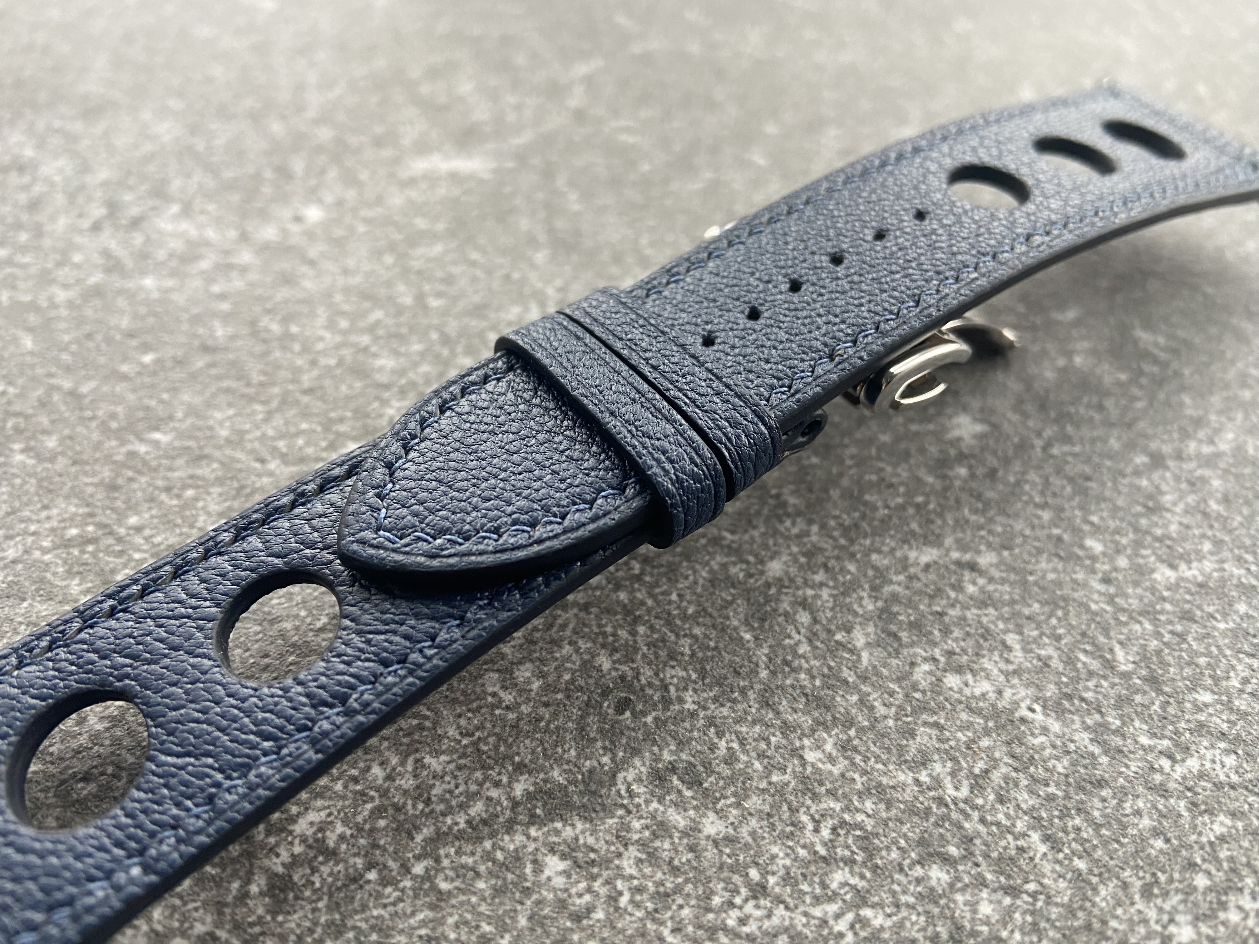 Capture the spirit of classic 1960s motorsport with this sophisticated Dark Blue Rally Leather Band for Apple Watch 42/44/45mm (Series 4-9, SE). Crafted from luxurious Alran Chevre “Sully” leather, this band exudes quality and style. The distinctive rally design, featuring prominent cutouts, adds a sporty touch while ensuring breathability and comfort.