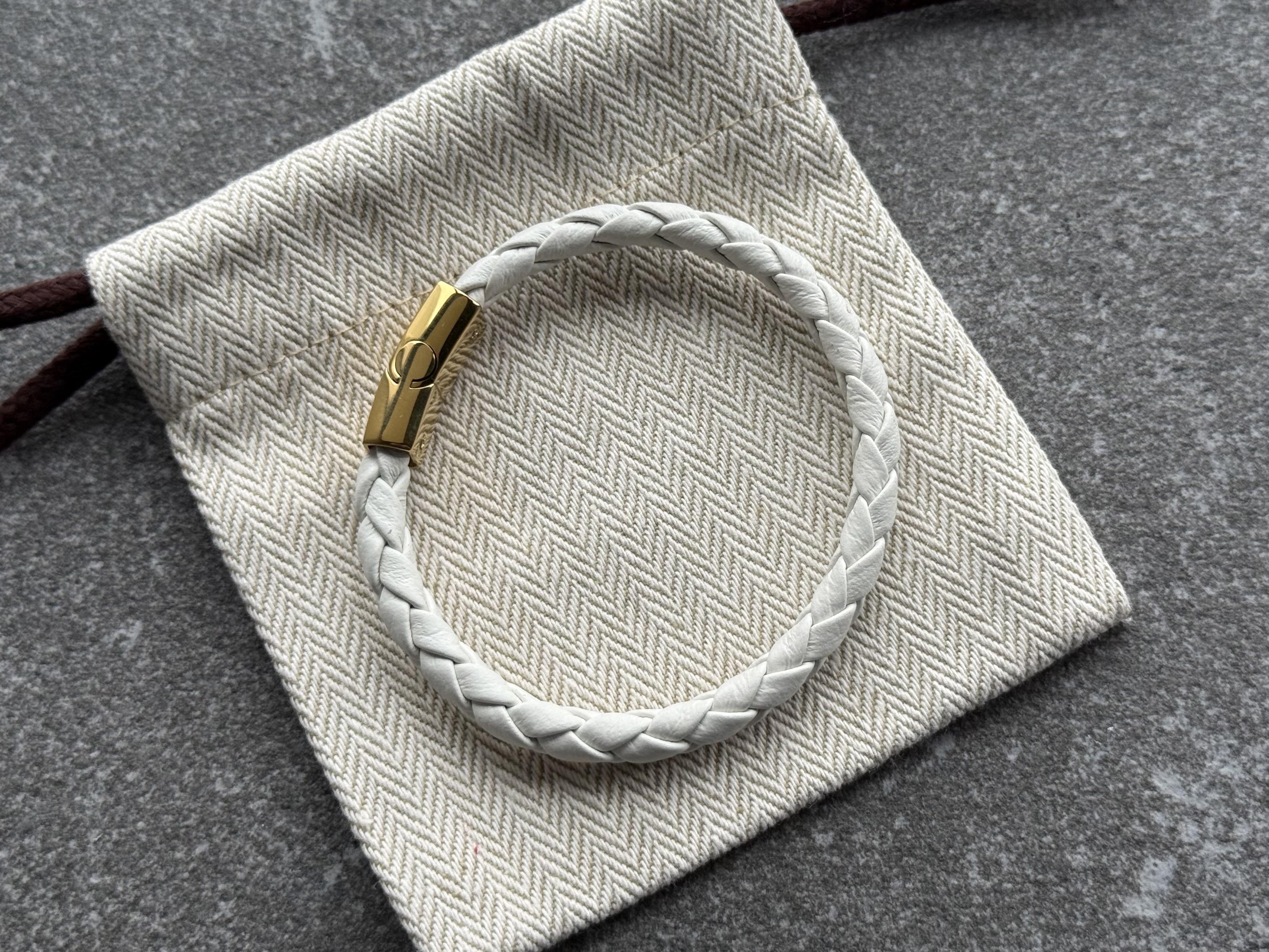 The clasp is made of 316L stainless steel with an IP 24k gold plated finish, polished to a mirror shine. The magnetic mechanism closes with a smooth click and keeps the bracelet securely in place during daily wear. Neutral white leather and warm gold tone make this piece easy to combine with a classic watch or to wear on its own as a minimalist everyday detail.