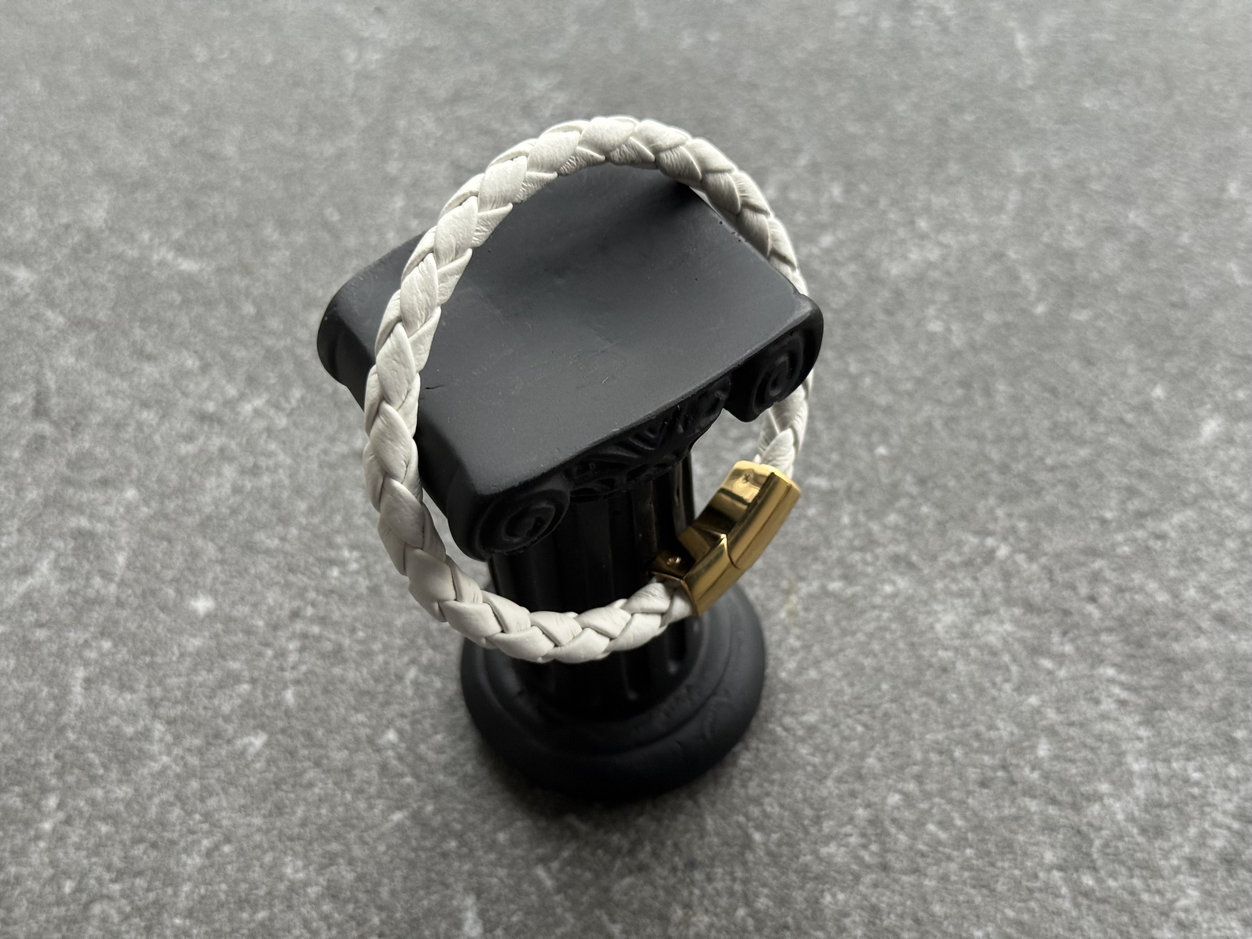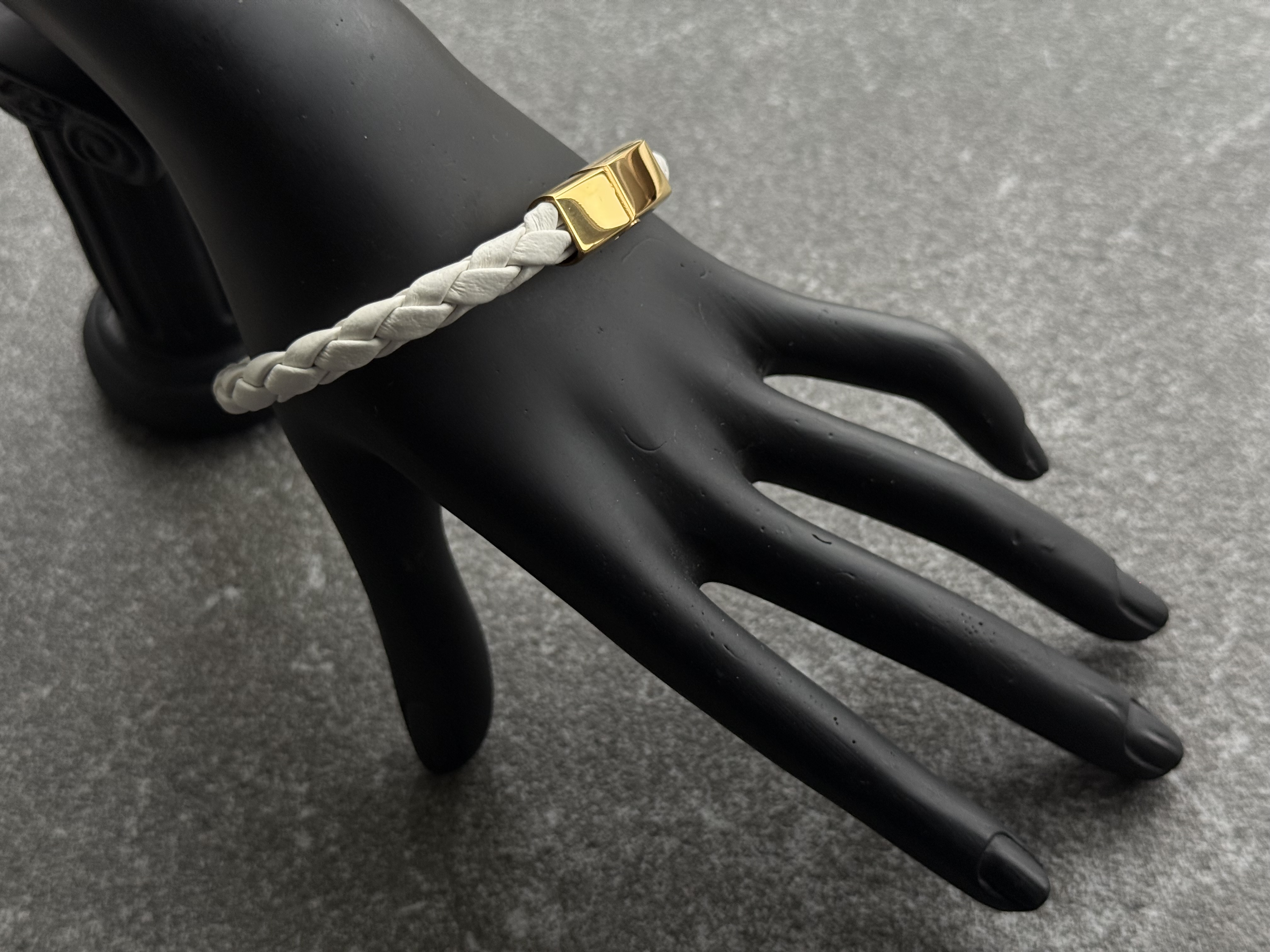 This bracelet is hand-braided from soft white calfskin leather with a natural grain texture. The leather strip is folded and finished along the edges before braiding, so no raw cuts touch the skin. The rounded braid feels light and flexible on the wrist, while the clean geometry of the clasp adds a discreet architectural accent.