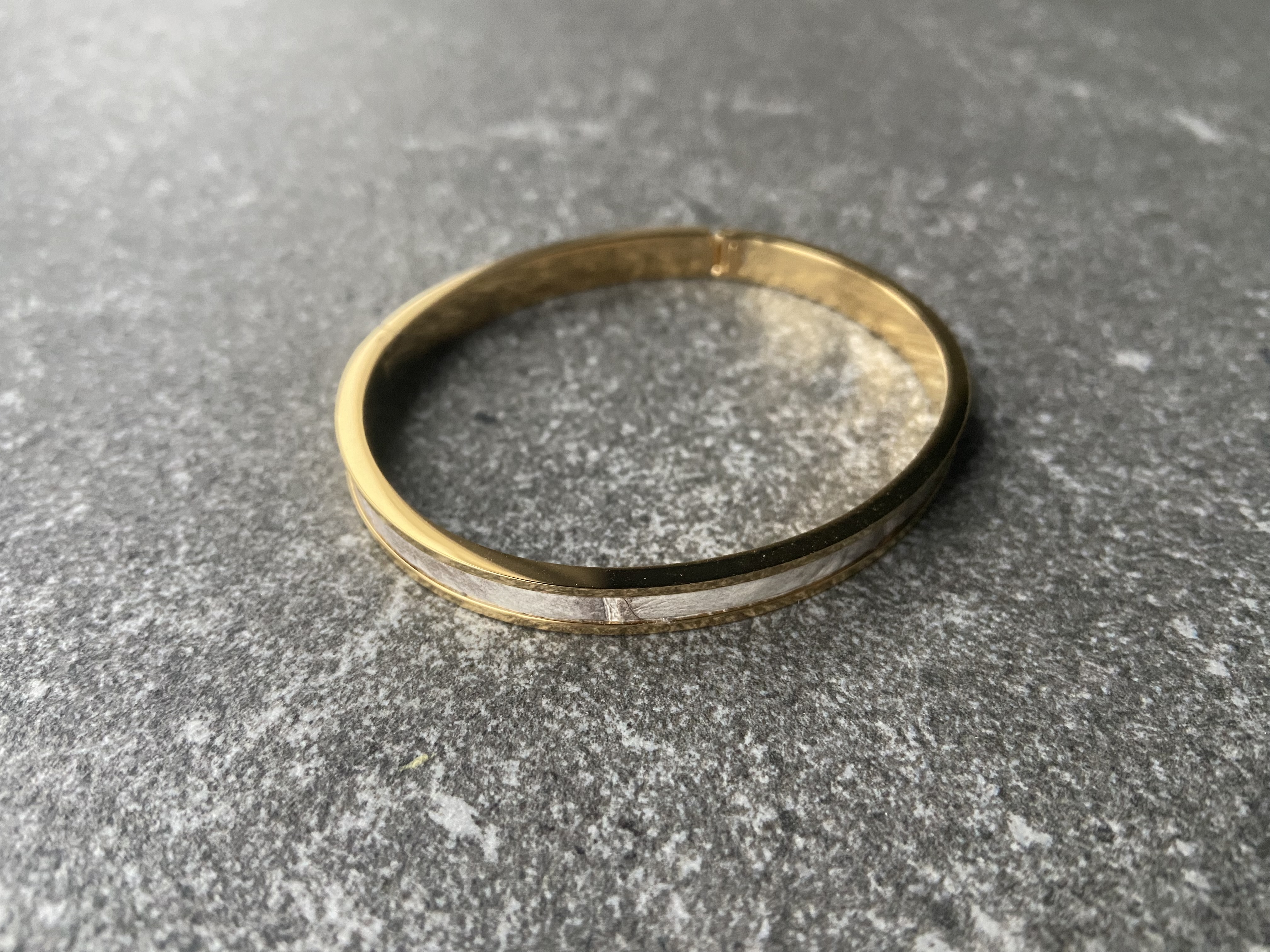 316L stainless steel clic bracelet with IP 24K gold plating and a hand-set Himalaya leather inlay. The warm gold tone of the polished metal and the soft ivory-to-grey gradient of this leather create a calm, understated contrast and make the bracelet easy to combine with a watch or other accessories.