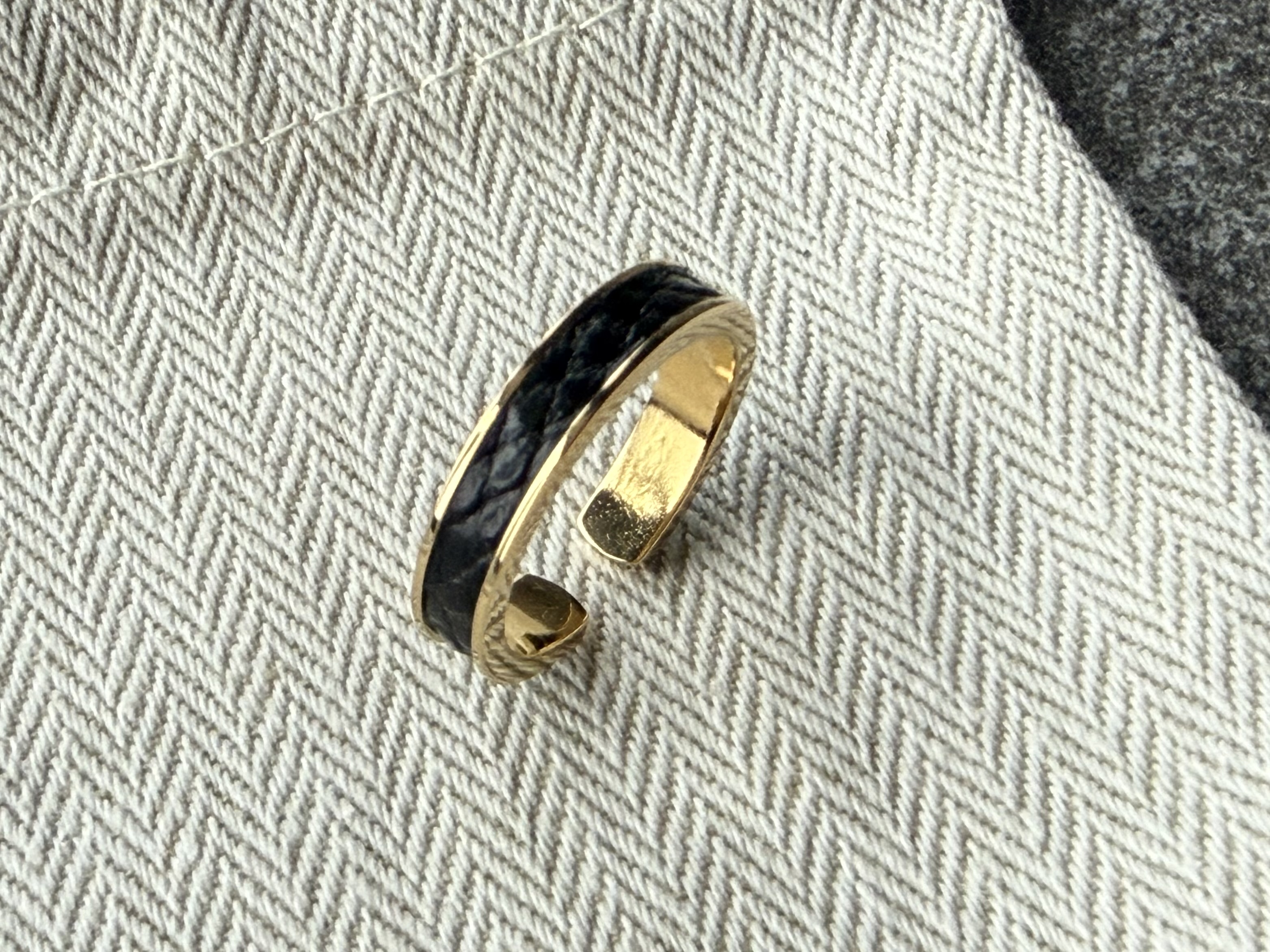 316L stainless steel ring with IP 24K gold plating and a hand-set leather inlay from my Obsidian Scale Line. The warm gold tone of the metal and the deep black, scale-like texture of the leather create a clean, graphic contrast with a discreet, refined character.