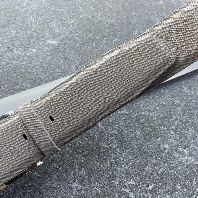 Elegant grey belt crafted from premium Saffiano calfskin, showcasing meticulous handmade craftsmanship. Features a versatile 40mm width and a palladium-coated brass buckle.