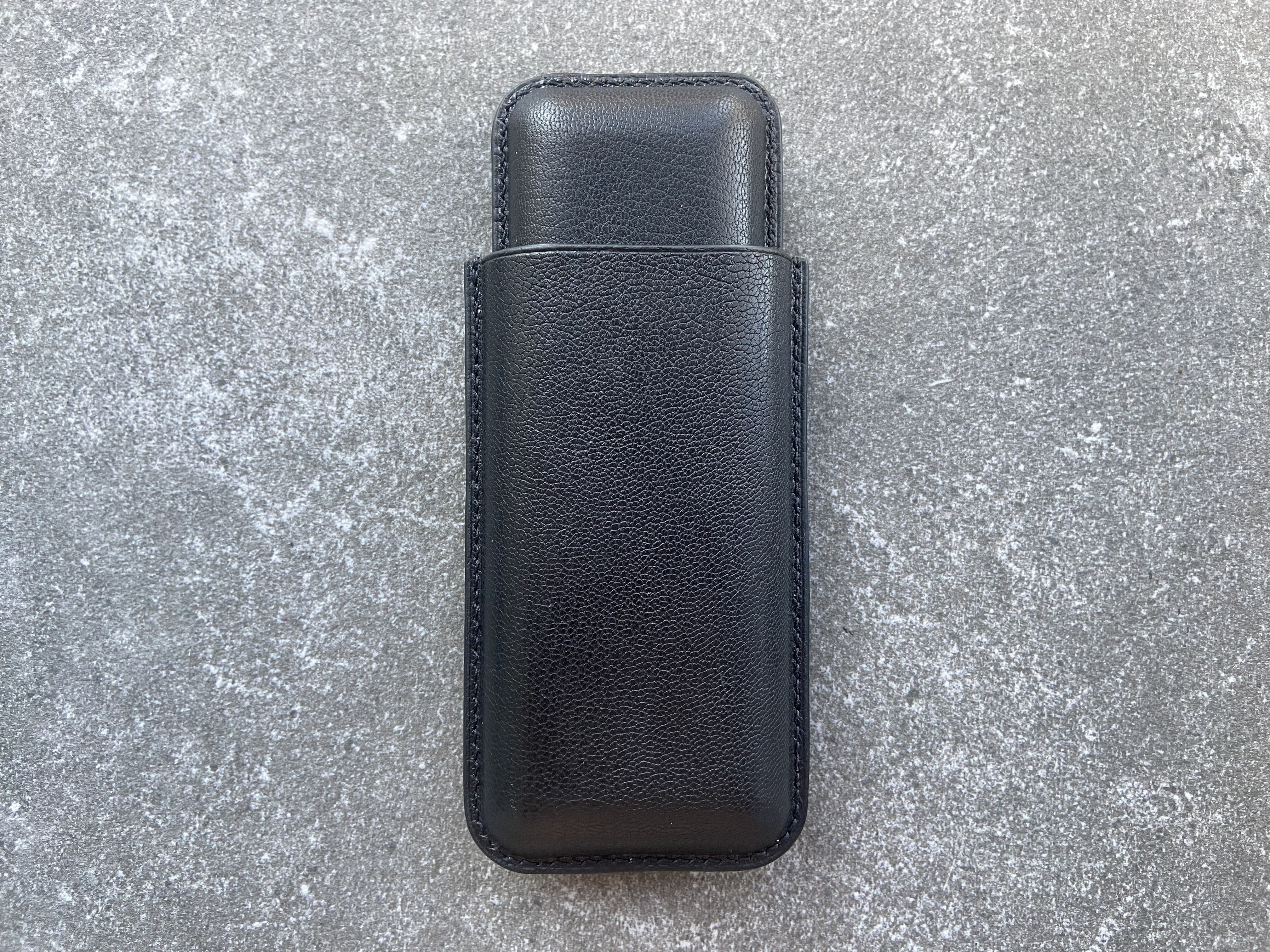 This leather cigar case is designed for those who prefer to carry cigars not in a paper or plastic sleeve but in a restrained leather accessory. The form is structured and compact so that the case can be placed in a jacket pocket or bag while still protecting the cigars from pressure and accidental damage.