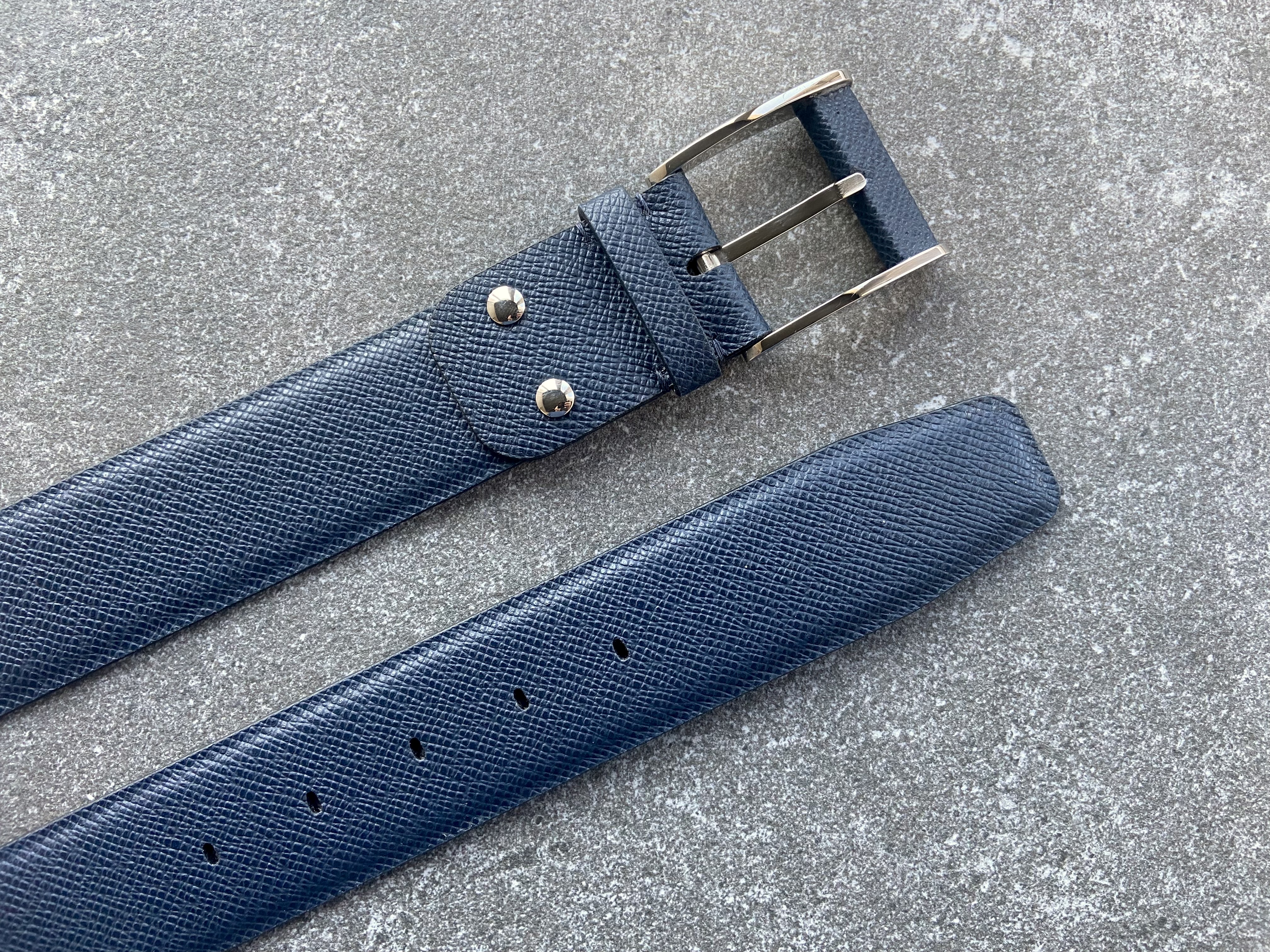 This sophisticated belt, made from premium Saffiano calfskin, represents timeless style and exceptional quality. Carefully handcrafted from start to finish, it reflects a dedication to artisanal tradition. The 40mm width ensures versatility, making it an ideal accessory for both formal and casual attire. The palladium-coated brass buckle adds a luxurious finishing touch, elevating the belt’s refined design. A perfect blend of elegance and practicality for the discerning wearer.