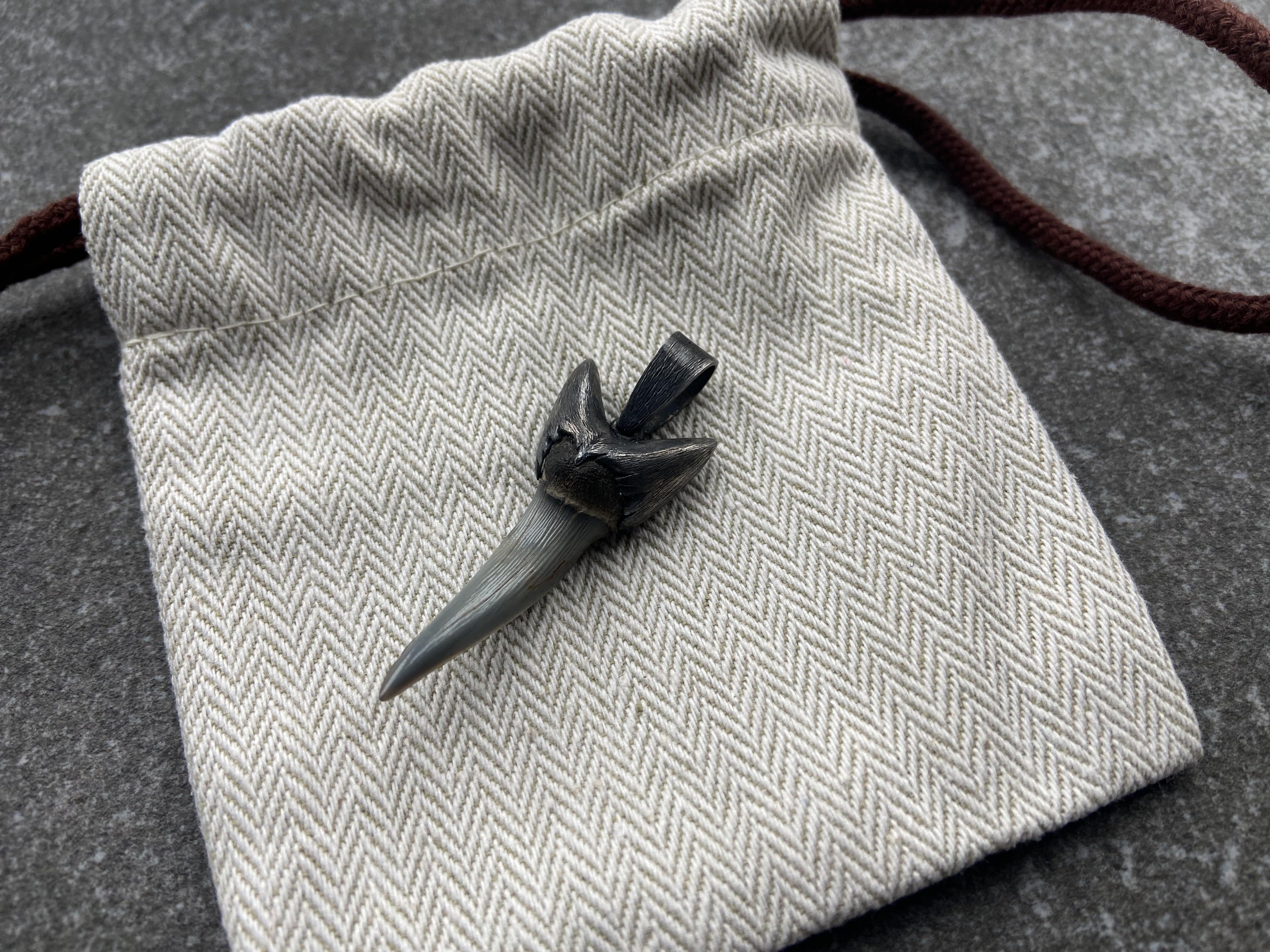- Material: 925 Sterling Silver (blackened, textured finish), Fossilized Shark Tooth (Late Cretaceous Period, Mesozoic Era)