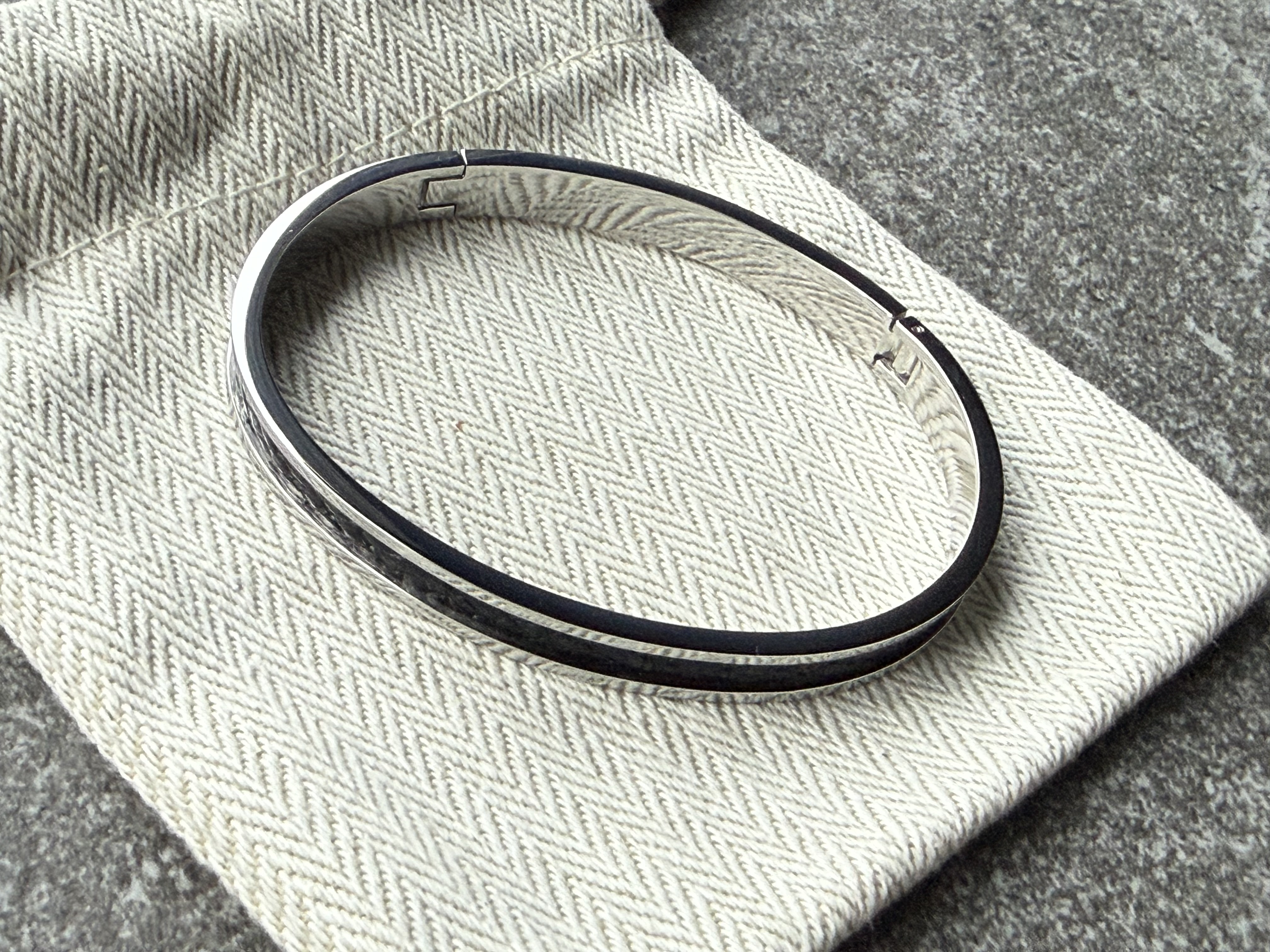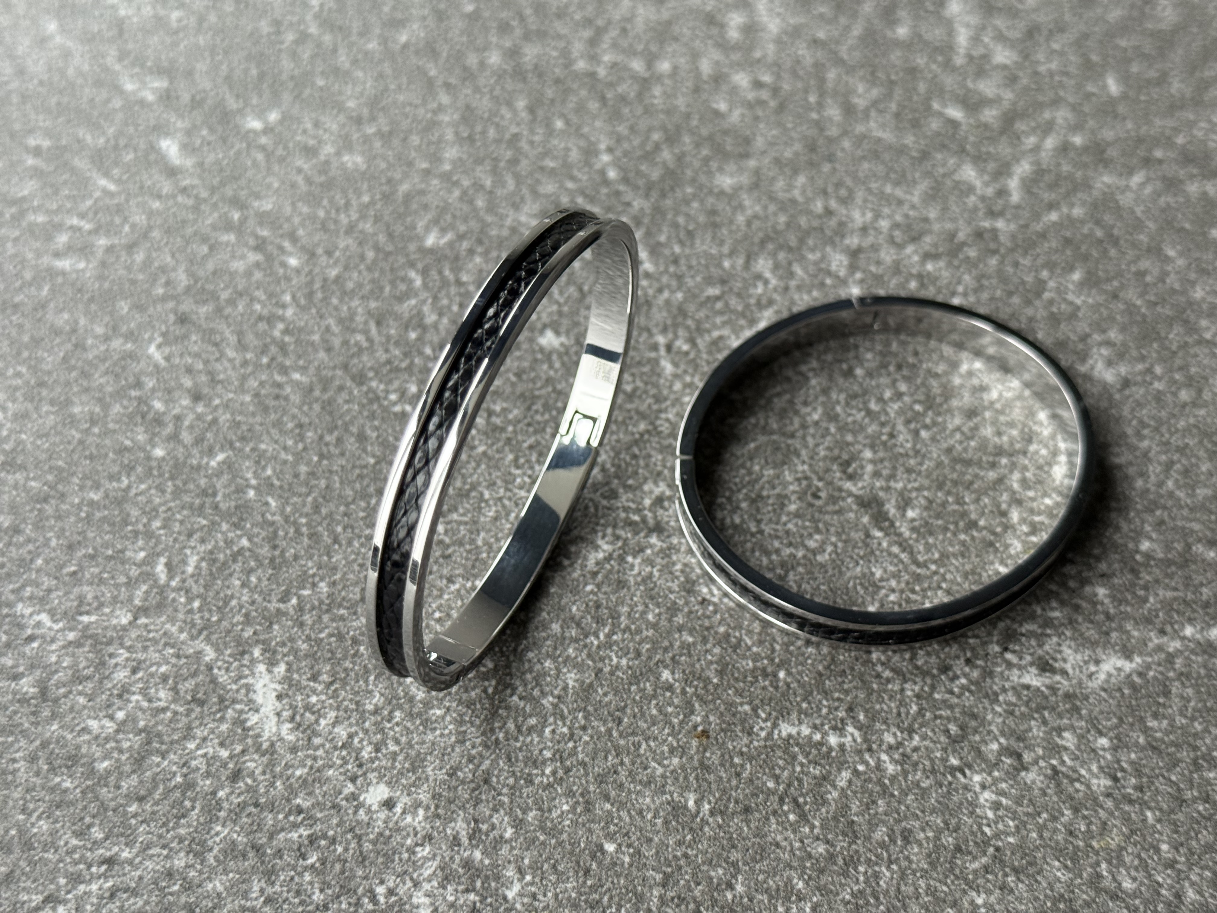 316L stainless steel clic bracelet with a hand-set leather inlay from my Obsidian Scale Line. The deep black shade and subtle, scale-like pattern of the leather create a clean, graphic contrast with the polished metal and keep the overall look minimal and restrained.